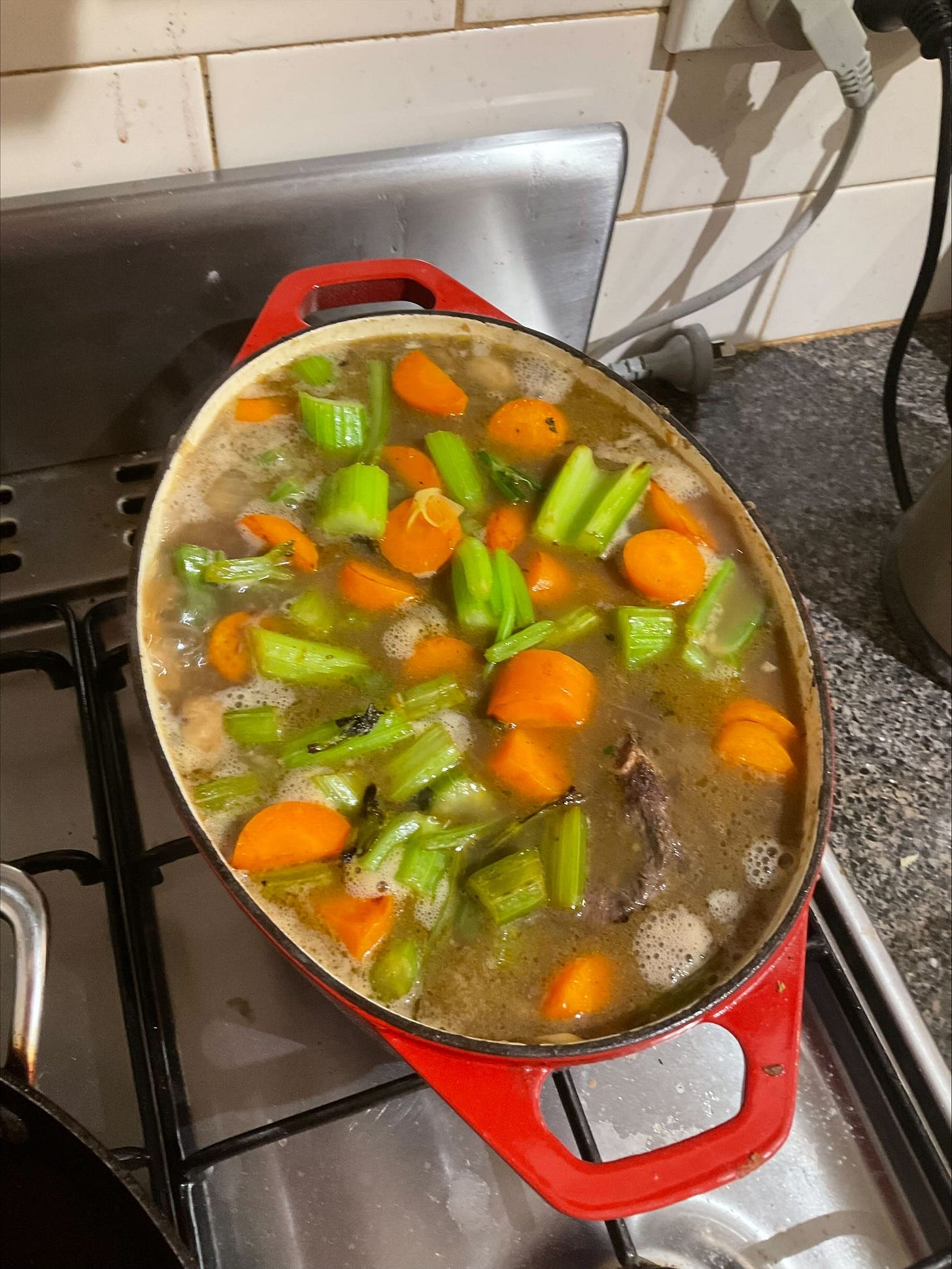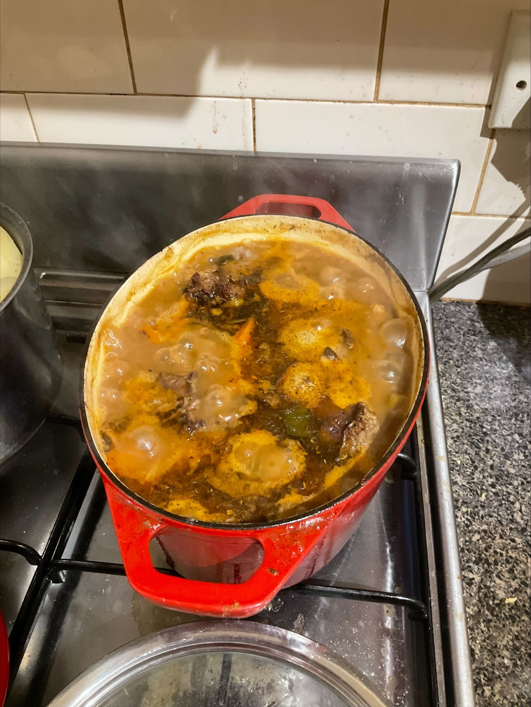 The essence of a good stew is a ((slow)) emulsification of disparate elements into a homogenous dish, without sacrificing depth of flavour. Ingredients that would constitute a "complete" meal in their own right (the meat, caramelised vegetables, wine, broth, whatnot) enter a unique relationship, and something new is forged out of seemingly opposing forces. Oil and water; sweet and saline; solid and liquid. All are brought into harmony with the help of only gentle heat and patience.